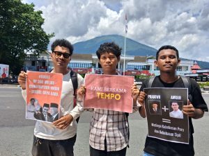 Ketua AJI Ternate Yunita Kaunar dalam orasinya menyebut gugatan tersebut menunjukkan sikap pemerintah yang anti terhadap kritik. “Aksi solidaritas ini bukan hanya tentang Tempo, tetapi perjuangan bersama atas suara media yang coba dibungkam,” tegas Yunita.