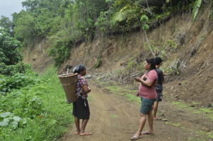 Jalan yang sedikit terjal dan tidak jauh dari sungai Togorangot itu tidak sulit kami lewati. Sesekali kami kerap berpapasan dengan beberapa perempuan yang membawa saloi, yang pulang dari ladang membawa pisang dan kacang. Jarak pegunungan untuk dapat mengakses internet dengan stabil sekitar 300 meter dari pemukiman warga.